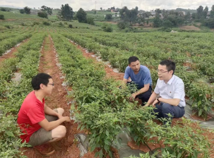▲洪术华(右一)在种植基����� �������Ƴ������������ �������Ƴ������������ �������Ƴ������������ �������Ƴ�������地查看辣椒长势